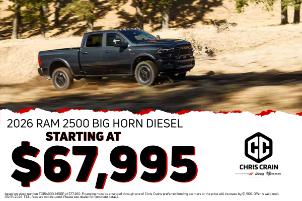 based on stock number TG154900. MSRP of $77,260. Financing must be arranged through one of Chris Crains preferred lending partners or the price will increase by $1,500. Offer is valid until 03/31/2026. TT&L fees are not included. Please see dealer for complete details.
