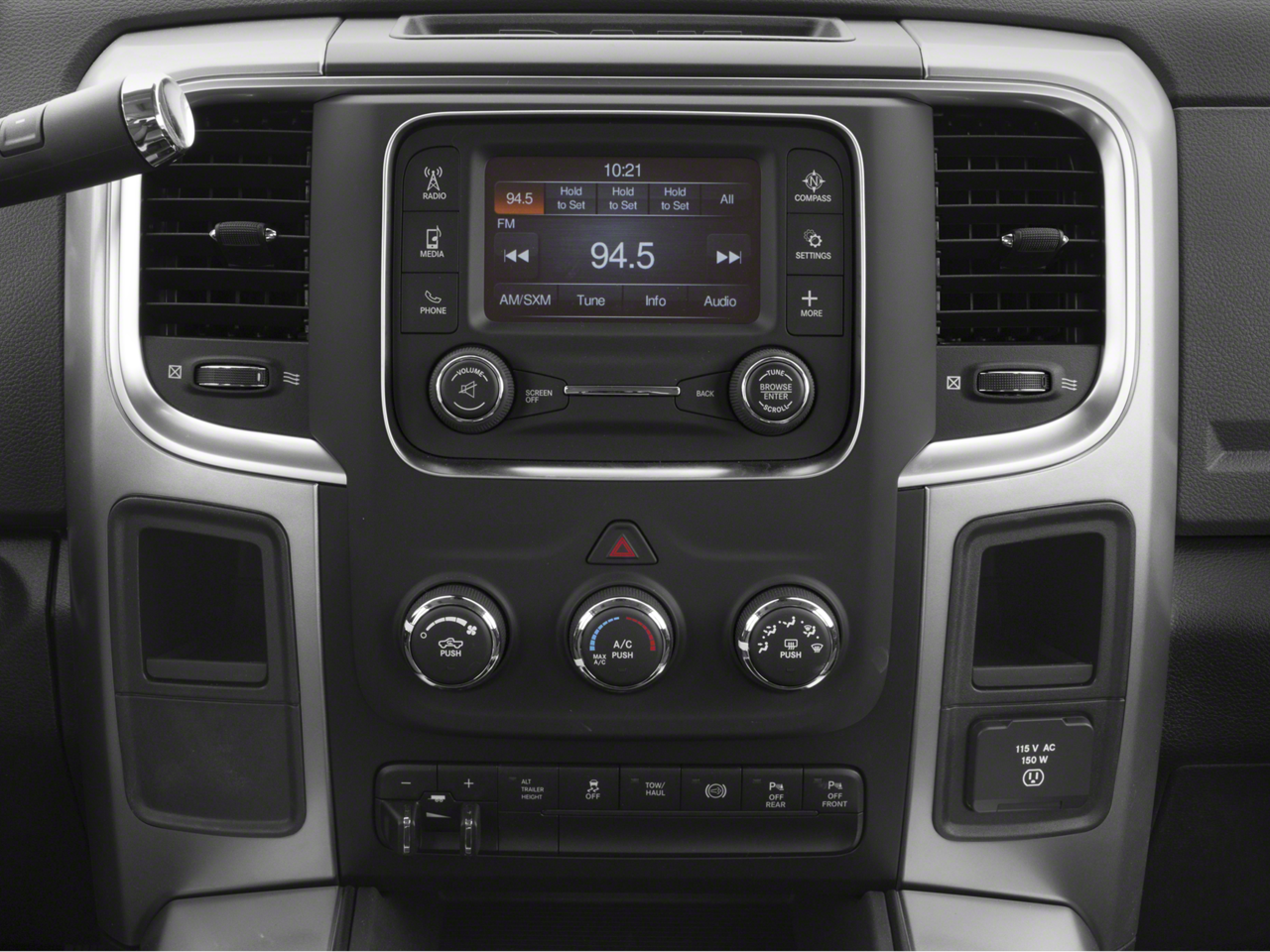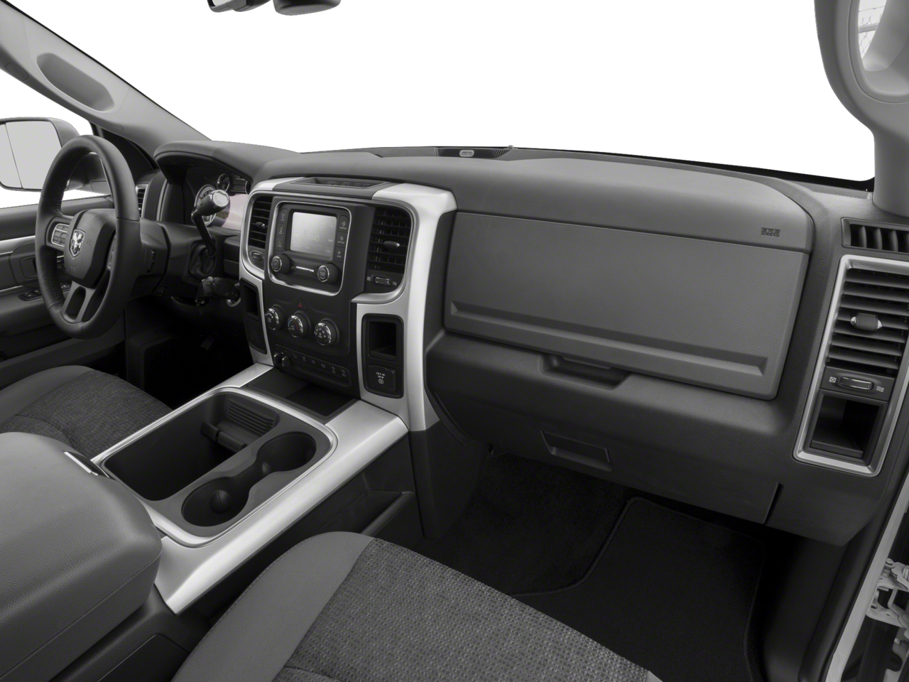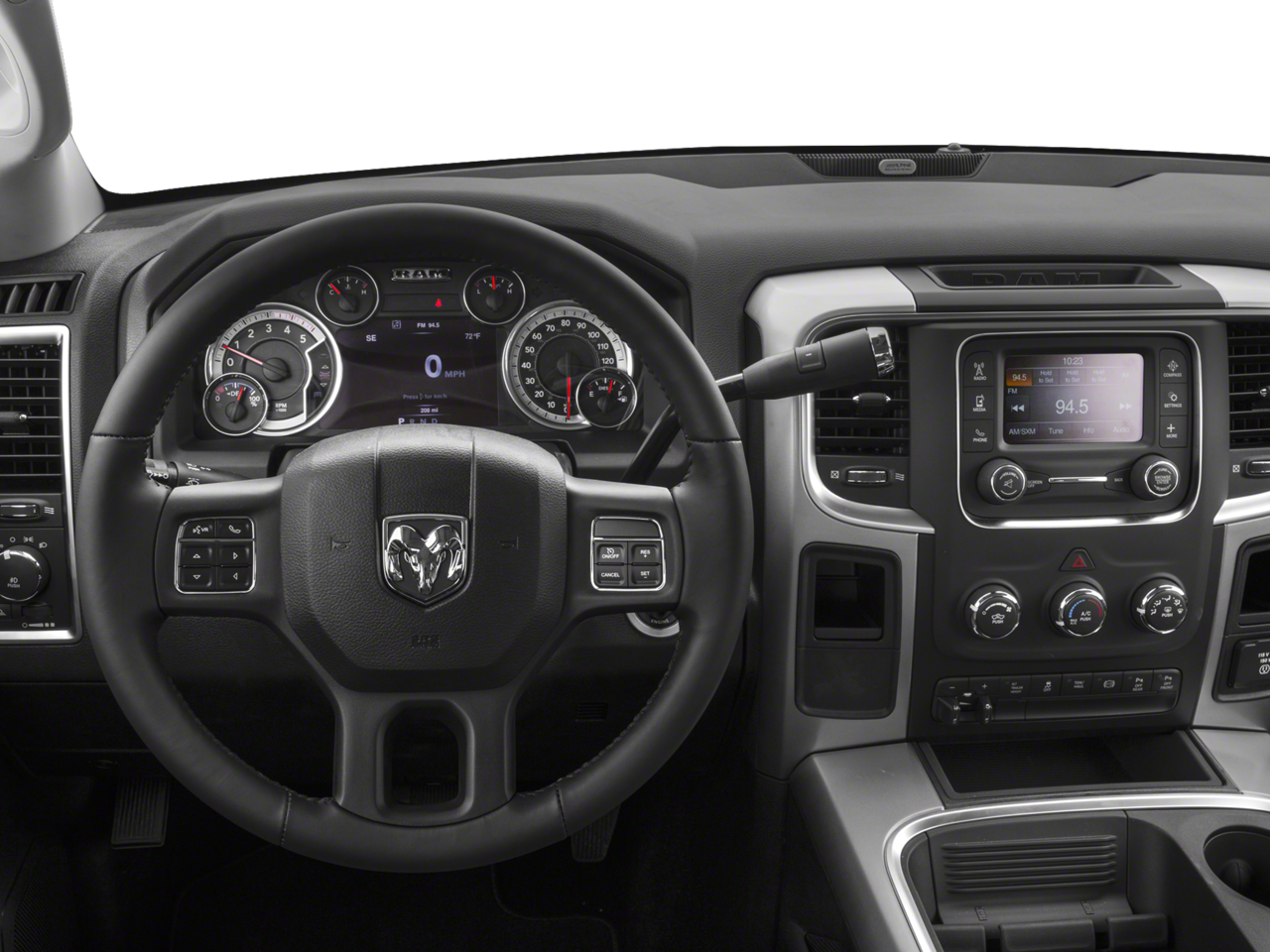 The Sport Appearance Group adds a touch of style, with features like black painted aluminum wheels, a black Ram head tailgate badge, and body-color accents that give this truck a commanding presence on the road. The Quick Order Package 22Z Big Horn further enhances the experience, providing a leather-wrapped steering wheel, steering wheel-mounted audio controls, and a rear backup camera.