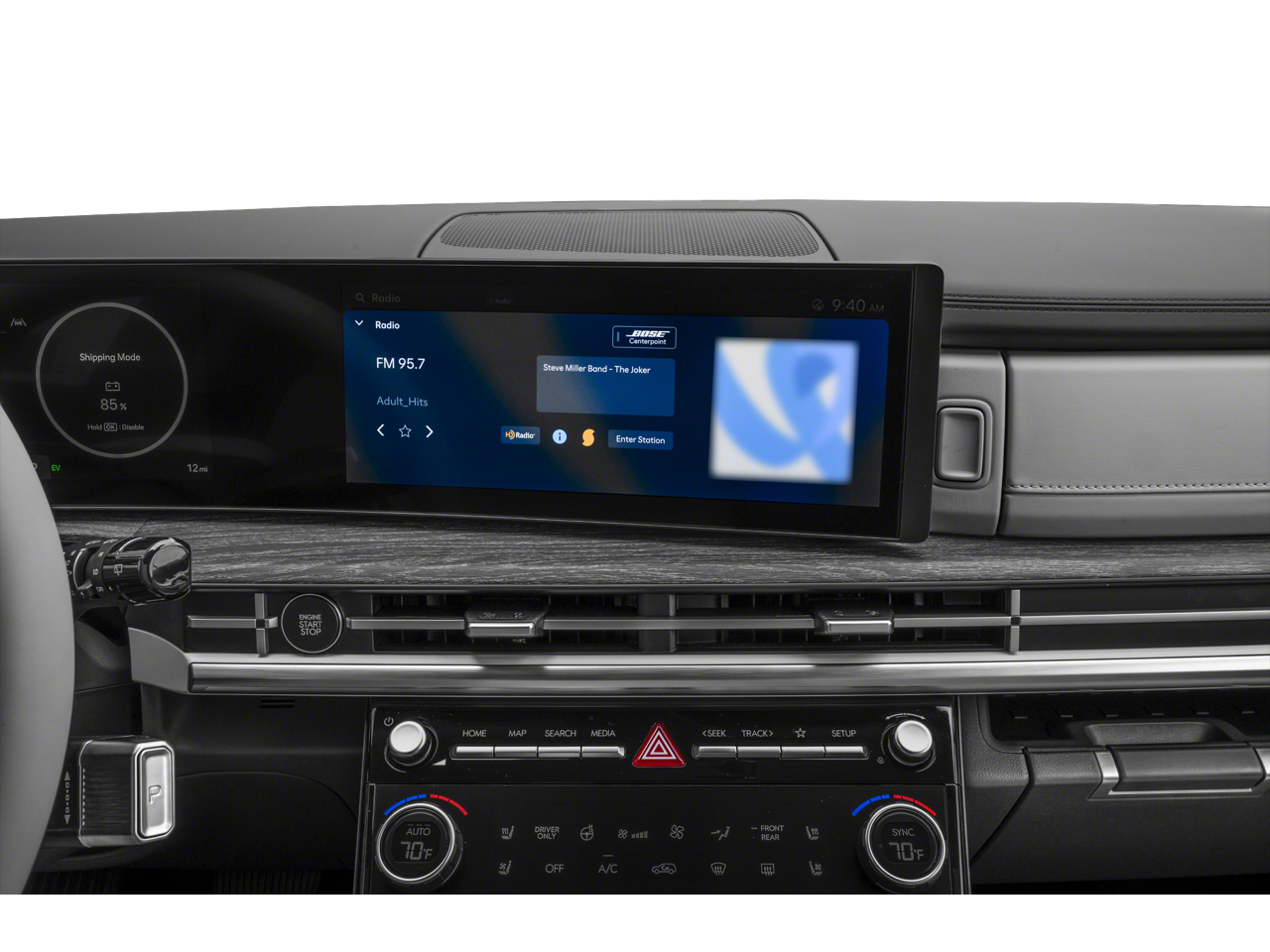 - Radio: AM/FM/HD Bose Premium Audio System -inc: 12 speakers including subwoofer, external amplifier, 12.3" wide touchscreen, Apple CarPlay and Android Auto, Bluetooth® hands-free w/wireless audio streaming, dynamic voice recognition, USB connectivity, SiriusXM, Blue Link connected car system, navigation system including traffic flow w/incident data via HD Radio (HERE), OTA updates (map only) and rear seat quiet mode